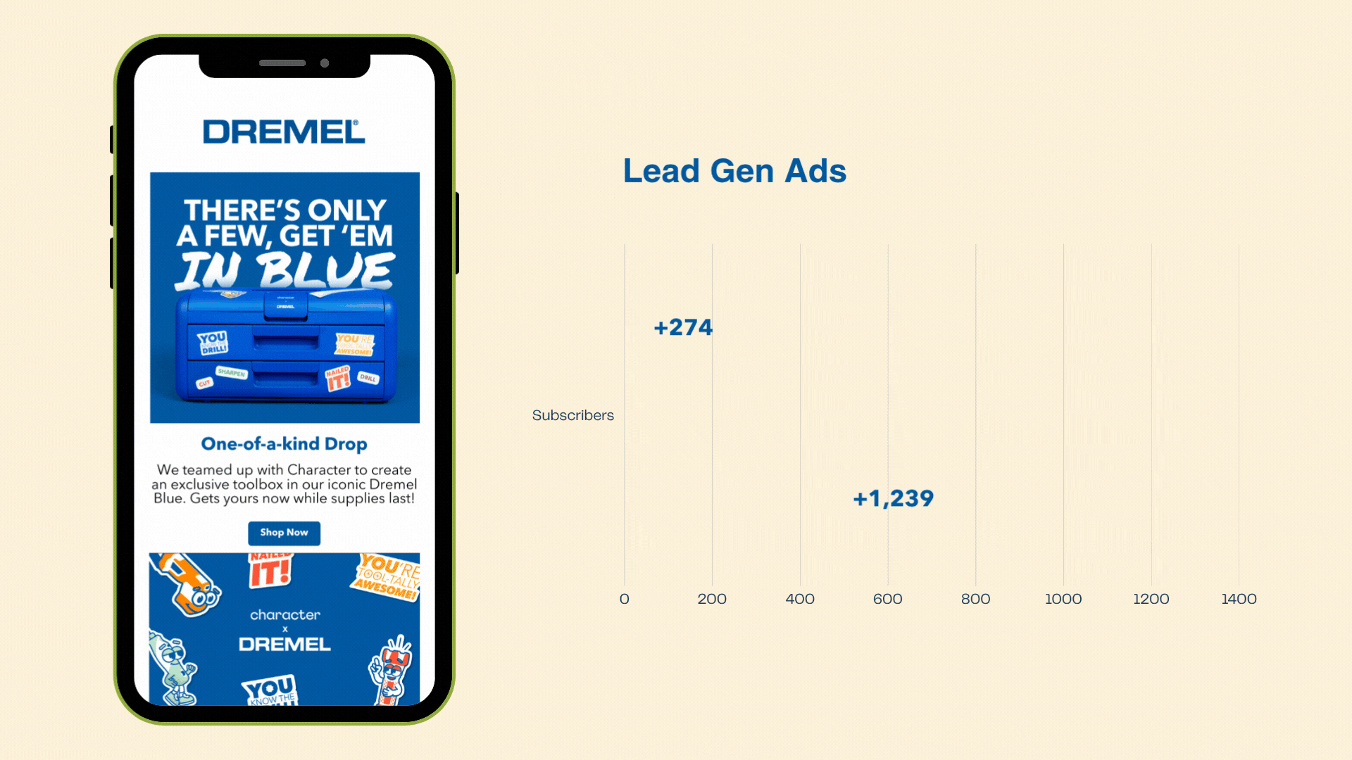 On average, our lead gen ads have gotten 9 leads per day. The Character x Dremel campaign was at 212 leads per day, which is +184% above average. Within the first 5 days, we received +1,239 email subscribers through media. In the past, the most subscribers we’ve received is +274 in a month.